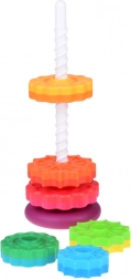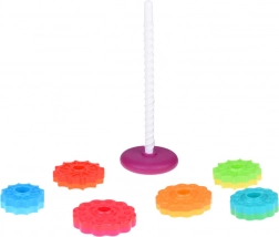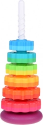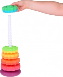 A különböző textúrájú rakosgató karikák támogatják a sensoros érzékelést és a koncentrációt. A legnagyobbtól a legkisebbig való építés segíti a logika, a türelem és a korai matematikai készségek fejlődését. A világos színek elősegítik a vizuális stimulációt és a színek tanulását.