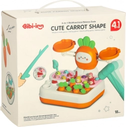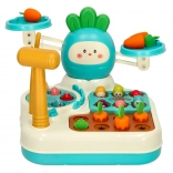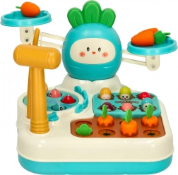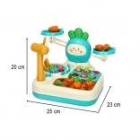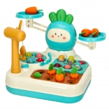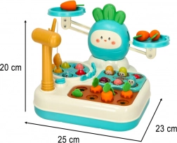 Ez a színes, multifunkciós készlet négy különböző tevékenységet egyesít egyben. A kalapácsnak, a horgászbotnak, a répáknak és a mérlegtálaknak köszönhetően a gyerekek egyensúlyt és súlyösszehasonlítást tanulnak, fejlesztik a észlelést, valamint gyakorolják a türelmet és a pontosságot.