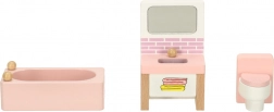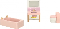 Kád, mosdó, WC, valamint konyhai szett mosogatóval, tűzhellyel, hűtővel, asztallal és székekkel. A gyerekek játék közben gyakorolhatják a mindennapi rutint.
