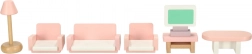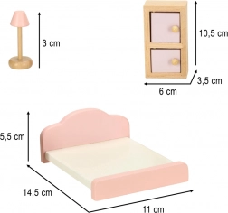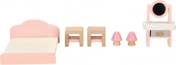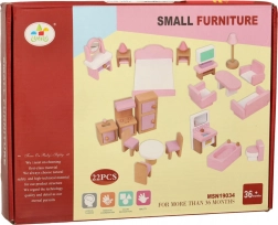 Stílusos fa babaház bútorszett, amellyel felszerelhető a nappali, hálószoba, fürdőszoba és konyha. Minőségi természetes fa, biztonságos rózsaszín és fehér festés, összesen 22 darab. Támogatja a kreativitást, a térbeli képzelőerőt és a játékos tanulást már 3 éves kortól.