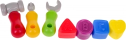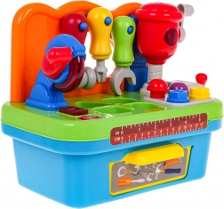 Az asztallap alatt egy nyitható fiók van, ahova a gyerekek elhelyezhetik szerszámaikat, valamint különböző formájú és betű alakú blokkokat. A műhely három darab AG13 típusú elemmel működik, amelyek a csomag részét képezik.