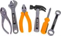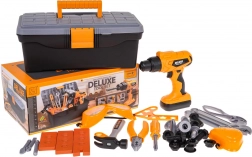 Ez a gyerek szerszámkészlet mindent kínál, amire egy kis ezermesternek szüksége lehet: nagy szerszámos láda, védőszemüveg és maszk, kalapács, csavarhúzó, fogók, kulcsok, valamint építőelemek csavarokkal és tiplikkel. A minőségi műanyagnak köszönhetően a szett könnyű, tartós és ideális a profi szerepjátékhoz.
