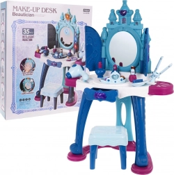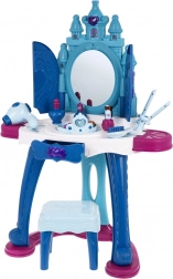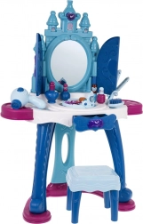 Varázslatos fésülködőasztal kis hercegnőknek 3 éves kortól, amely fény- és hangeffektekkel, nagy, nyitható tükörrel hercegnő-vetítéssel és automatikus „ajtócskákkal”, tágas munkafelülettel, fiókkal és polcokkal érkezik. A csomag része egy kényelmes kisszék és gazdag kozmetikai kiegészítő készlet. Minőségi, stabil szerkezet, 3× AA elemmel működik (nem tartozék).