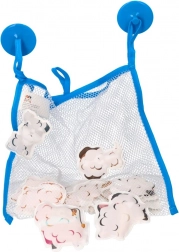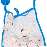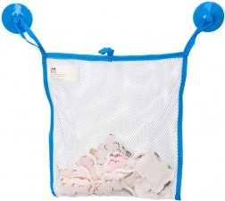 A készletet tágas háló (23 × 27 cm) egészíti ki két tapadókoronggal a sima felületekre való rögzítéshez. A háló megkönnyíti a játékok rendszerezését, a gyors vízlecsöpögtetést és a higiénikus szárítást, így a fürdőszoba rendezett marad.