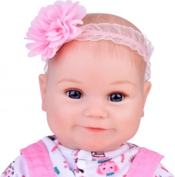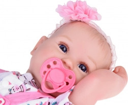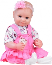 Ez a bájos kisbaba minőségi anyagokból, aprólékos részletekkel készült – puha teste, mozgatható gumis karjai és lábai, valamint élethű arcvonásai vannak kék szemekkel és hosszú szempillákkal. A feje festett hajjal készült, így a legkisebb gondoskodók számára is ideális. A rózsaszín árnyalatú ruha állatkás motívumokkal és virágos fejpánttal gyengéd, finom megjelenést kölcsönöz a babának.