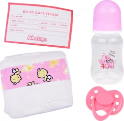 A csomagban cumisüveg, mágneses cumi, pelenka és születési bizonyítvány található – minden, ami a valósághű babagondozáshoz kell.