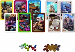 - Gazdag játékelemek – árumkártyák, speciális kártyák, érmék és fa kockák a remek hangulatért.
