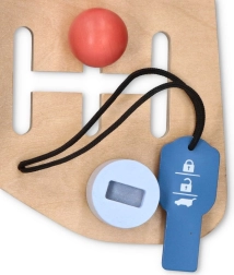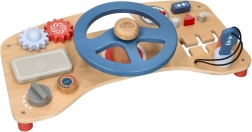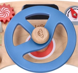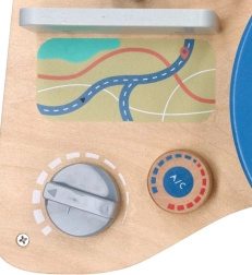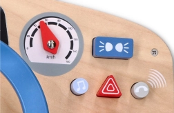 A fa kormány elemek nélkül működik, és autentikus hangélményt nyújt a gyerekeknek a sípoló kürtnek és a kattogó gombnak köszönhetően.