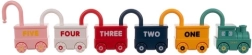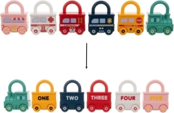 Színes készlet hat járművel és egy mozdonyból álló lakat formájú játékokkal és kulcsokkal, amelyek megtanítják a gyerekeknek a 0–5 számokat és a színeket. Biztonságos ABS műanyag, sima, lekerekített élek, egyedi, számozott kulcsok és a járművek vonattá kapcsolásának lehetősége teszik ezt a játékot ideális választássá 18 hónapos kortól.