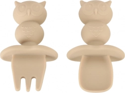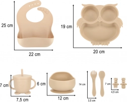 A három rekeszes, bagoly alakú tányér vonzó módon segít elkülöníteni az ételeket. A puha, élelmiszeripari szilikon kíméletes a gyermek ínyéhez, biztonságos és könnyen tisztítható. Az ergonomikus evőeszközök (normál és mini) jól illeszkednek a kis kezekhez, és támogatják a finommotorika fejlődését.