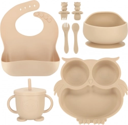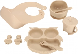 Ez a bézs szilikon étkészlet megkönnyíti a gyerekek számára az önálló evés elsajátítását, a szülőknek pedig nyugodtabb étkezést biztosít. A tányér és a tál tapadókorongjai megakadályozzák a felborulást, a szívószálas bögre segíti az önálló ivást, a mély zsebbel ellátott előke pedig felfogja a lehulló falatokat.
