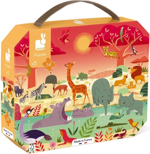 JANOD kirakó szavannai képpel. A kirakó eredeti, praktikus bőröndben van csomagolva, amely otthonra és utazáshoz is ideális. A csomag tartalmaz egy poszter-mintát is.