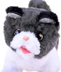 Az interaktív cica puha plüss anyagból készült műanyag szemekkel és orral, ami valóságos megjelenést kölcsönöz neki.