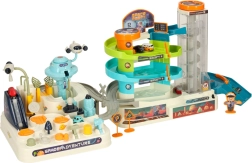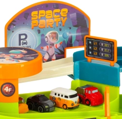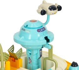 A multifunkcionális űrbeli autópálya kétszeres izgalmat és játéklehetőségeket kínál. Két útvonalának köszönhetően lehetőség van két kisebb kört alkotni, vagy egy nagy pályává alakítani és figyelni, hogyan száguldoznak a kisautók az űrbeli tájban. A nagy pálya elektromos lifttel van felszerelve, amely automatikusan szállítja az autókat a csúcsra, biztosítva a folytonos szórakozást. A kisebb pálya interaktív elemeket tartalmaz, amit a gyermeknek magának kell kezelnie, ami elköteleződést és kézügyesség fejlesztést igényel tőle. A csomagban található hat jármű, köztük rendőrautó és mixerautó, amely változatos szórakozás lehetőséget kínál.
