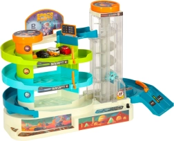 A gyerekek figyelhetik, hogyan közlekednek az autók a pályán elektromos lift és kanyargós utak segítségével, fejlesztve a látásukat.
