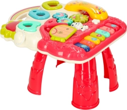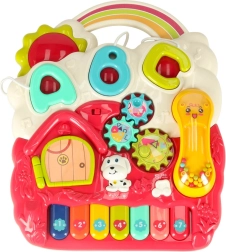 Hétbillentyűs zongorácska, fogaskerekek, betűk, a kutyaházikó ajtaja és a levehető telefon fejlesztik a gyermek érzékelését és finommotorikáját.