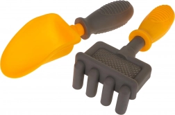 A készletben gereblye és lapát is található. Ezek az eszközök lehetővé teszik a kreatív játékot, és fejlesztik a gyerekek építési készségeit homokban vagy kavicsban.