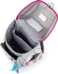 Átgondolt belső elrendezése elegendő helyet kínál a tankönyveknek, füzeteknek és az uzsonnának. A belső rendszerező, több zseb és a cipzáras rekeszek egész iskolanapon át rendet tartanak. A szett része egy praktikus tornazsák összehúzható zsinórokkal és egy egyemeletes tolltartó két kihajtható füllel és gumis hurkokkal.