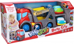 Szórakoztató készlet a kis sofőröknek: Kiddy autómentő 31 cm hosszban és két 9 cm-es személyautó. Kínál fény- és hangeffekteket, szabadon futó kerekeket a sima guruláshoz, valamint lehajtható rámpát két platóval az egyszerű berakodáshoz. 18 hónapos kortól ajánlott, az elemek 2× AA mellékelve.