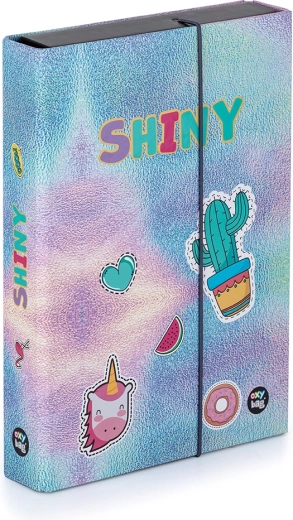 A Box A5-ös füzetekhez Jumbo OXY Style Mini Shiny a minden iskolás felszerelésének elengedhetetlen része. Tartós laminált anyagból készült, amely védi a tartalmat a sérülésektől. A gumis záródásnak köszönhetően biztosított, hogy a füzetek és papírok ne essenek ki. Kompakt méretek és a gerinc szélessége 4 cm, mely lehetővé teszi a könnyű tárolást az iskolatáskában.