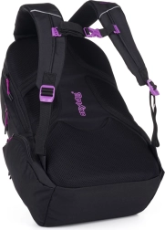 A fekete alapot rózsaszín–lila márványos minta és markáns részletek egészítik ki. A hátizsák illik iskolába, munkába és szabadidős használatra is.