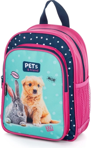 Könnyű és kényelmes óvodás hátizsák kis kedvencek motívummal, 3–6 éves gyerekeknek. Egy tágas fő rekeszt, egy kisebb uzsonnás zsebet és oldalsó palacktartó zsebeket kínál. Ideális szakkörökre, kirándulásokra és óvodába.