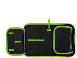 Egyemeletes iskolai tolltartó 2 füllel, üres, 25 gumis hurkot tartalmaz az írószerek rögzítéséhez. A belső füleken átlátszó fóliák vannak az órarend számára.