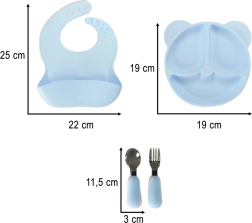 A készlet kiváló minőségű, élelmiszeripari minőségű, káros anyagoktól mentes szilikonból készül; tapintása puha, tartós és könnyen tisztítható. A maci alakú osztott tányér megkönnyíti az átlátható tálalást, a mély zsebbel ellátott előke tisztán tartja a ruhát, az ergonomikus evőeszközök puha szilikon fogóival pedig jól illeszkednek a kis kezekbe.