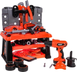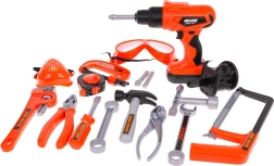 munkapad kb. 25 cm x 21,8 cm x 34 cm, .- munkapad kb. 39 cm x 21,8 cm x 34 cm, .- fúró/csavarozó kb. 17 cm x 16 cm x 5 cm, .- kalapács kb. 15 cm x 8,5 cm x 3 cm, .- fogó kb. 16 cm x 5,5 cm x 1,5 cm, .- hosszú csavarhúzó kb. 15,5 cm, .- villáskulcs kb. 17,5 cm, .- nyitott villáskulcs kb. 14,5 cm, .- csavarok lazításához és meghúzásához való kulcs kb. 9 x 11 cm, .- kézifűrész kb. 25 cm x 10 cm x 2,5 cm, .- láncfűrész fej kb. 11 cm x 8 cm, .- tipli kb. 5 cm x 3 cm, .- csavar kb. 4,5 cm x 3 cm, .- szorító kb. 13,3 cm x 7 cm x 2 cm, .- kulcs kb. 23 cm x 6 cm x 2 cm, .- védőszemüveg kb. 16 cm x 6,5 cm x 4 cm, .- mérőszalag kb. 6,5 cm x 5,5 cm, .- védőmaszk kb. 8,5 cm x 8 cm x 3,5 cm, .- tok kb. 35,5 cm x kb. 22 cm x 22,5 cm, . |