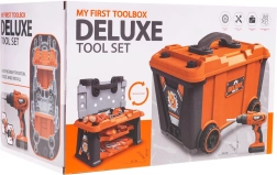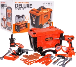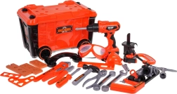 - bőrönd-műhely, .csavarozó, .- csavarhúzó fej, .- 3 x cserélhető bit, .- fúró elektromos fűrészfejjel, - kalapács, - lapos csavarhúzó, .- villás- és csillagkulcs, .- kulcs, - kulcs, - védőszemüveg, .- védőmaszk, .- mérőedény, - fafűrész, .- fogó, - kézifűrész, .- szorító, - mérőszalag, - 4 kerék a bőröndhöz, .- 3 csavarozható elem, .- csavarok, - csapszegek, .- anyák. |