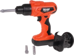 Jól felszerelt 2 az 1-ben szerszámkészlet kis barkácsolóknak 3 éves kortól. A készletből munkapadot építhetsz, majd játék után átalakíthatod a készlethez tartozó szerszámos bőrönddé. A szett 65 elemet tartalmaz, többek között műhelyelemeket, szerszámokat, fűrészt, csavarhúzókat, elemes fúrógépet/csavarozót, sok csavart stb. A csavarozó 2 x 1,5 V AA elemmel működik, az elemek nem részei a csomagnak. A csavarozó úgy működik, mint az igazi: csavar be- és kicsavarás, levehető akkumulátorral, 3 cserélhető bittel és fűrészfejjel. |