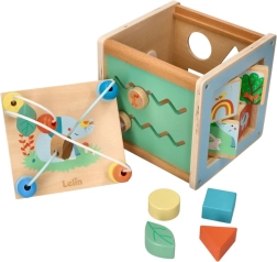 A LELIN márka minőségi fa aktivitási kockája minden oldalon változatos tevékenységeket kínál. A drótokon futó színes gyöngyök, labirintusok, formabedobó és fogaskerekek lekötik a figyelmet, és természetes módon fejlesztik a készségeket, a kreativitást és a türelmet.