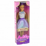 Varázslatos ANLILY PRINCESS baba gyönyörű lila-kék ruhában, amely örömet szerez minden meserajongónak. Hosszú, fényes szőke haja könnyen fésülhető, lila koronát, hozzáillő cipellőket és elegáns nyakláncot visel. Ideális a kreatív játékhoz és a fantázia fejlesztéséhez. CE tanúsítvány, EN71 szabvány, 3 éves kortól ajánlott.