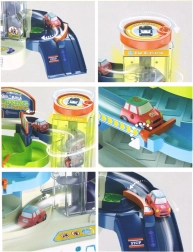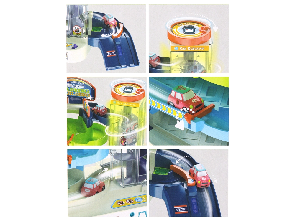 Az egyes parkolószintek négy parkolóhelyet kínálnak, ahol a gyerekek könnyedén parkolhatják le a mellékelt kisautókat. Egyedi elemként felvonó is szerepel, amely lehetővé teszi az autók szintek közötti mozgatását. A liftből való kijárat után az autók automatikusan lefelé haladnak, ami dinamikusabb és izgalmasabb játékot nyújt.