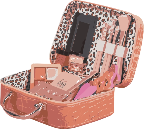 Sminkes bőrönd. Méret: 19 cm. Tartalmaz tükröt, műkörmöket, ajakfényt, pirosítót, szemhéjfestéket, körömreszelőket, ecsetkészletet, ajakbalzsamot, szemceruzát, csillogó díszítéseket.