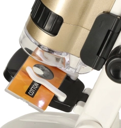 A mikroszkóp stabil alapra épült, LED lámpával, amely biztosítja az egyenletes megvilágítást. Két nagyítási fokozatának köszönhetően – 100x és 250x – lehetővé válik a szálak, sejtek és más anyagok szerkezetének legapróbb részleteinek megfigyelése.