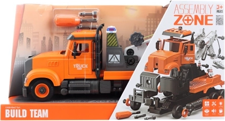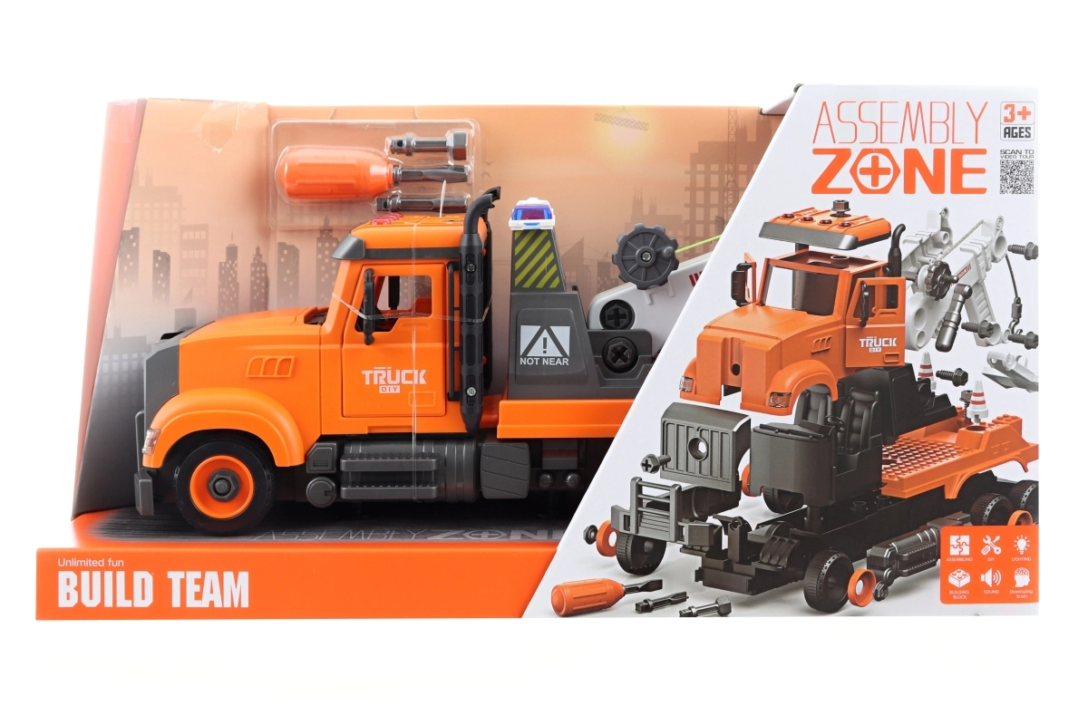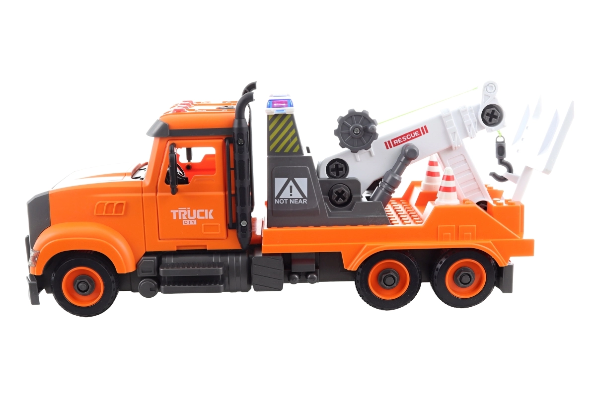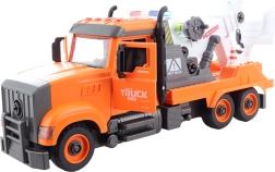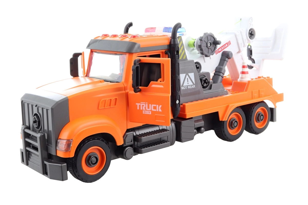 Gyönyörű, nagy csavarozható vontatóautó. 3 db AG13 elemmel működik, amelyek a csomag tartozékai. Az autó tetején 4 gomb található a következő funkciókkal: indítás, dudálás, tolatáskor sípolás és dallamok. Az autó lendkerekes. Anyaga műanyag. A csavarhúzó a csomag része. Nyitott dobozban csomagolva. A csomag mérete kb. 41×22×13 cm. Az autó mérete 36×15×11 cm. Ajánlott életkor: 3+.
