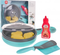 A csomagban találsz egy serpenyőt átlátszó fedővel, lapátot, kistányért, egy „ketchup” flakont és játékételeket (hal, steak, virslik) – mindent, ami egy képzeletbeli lakomához kell.