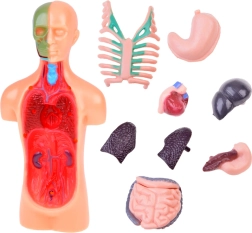 A szív, tüdők, máj, gyomor, hasnyálmirigy és belek kivehetők és visszahelyezhetők, így a tanulás szemléletes és szórakoztató.