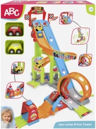 Ez a színes Mega Jump versenypálya az első versenyélményekhez készült. A masszív felépítésnek és az intuitív kezelésnek köszönhetően a gyerekek élvezhetik a sima lejtmeneteket, az adrenalin dús loopingot, valamint a kreatív játékot a műhelyben és a parkolóban. A két mellékelt jármű (kb. 7 cm) azonnali startra kész.