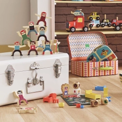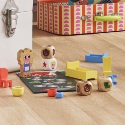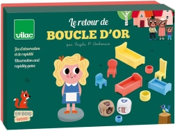 A játék 3 éves kortól ajánlott, és különböző játékelemeket tartalmaz, amelyek szórakozást biztosítanak kicsiknek és nagyoknak egyaránt. A játék részei: 1 karton játéktábla, 1 fa Aranyhaj figura, 2 fa dobókocka, 3 fa ágy, 3 szék, 3 tányér és 1 pamut zsák.