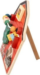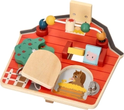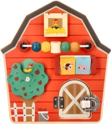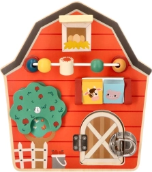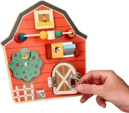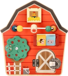 Kreatív és szórakoztató fa aktív tábla pajta alakban fejleszti a gyermekek finommotorikus képességeit és képzelőerejét az interaktív elemek segítségével.