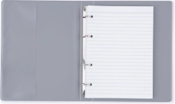 Stílusos A4-es gyűrűs jegyzetfüzet elegáns szürke színben, tartós PVC borítóval és 4 gyűrűs mechanikával. A csomag része 100 vonalas lap, ideális iskolába, irodába és otthoni jegyzeteléshez.