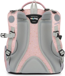 Az OXY GO Pillangó stílusos iskolatáska a mindennapi kényelmes viselésre készült. Anatómiailag formázott, légáteresztő hátlappal és állítható vállpántokkal rendelkezik a helyes hátilleszkedésért. A masszív, vízálló aljnak köszönhetően a tartalom biztonságban marad, a táska pedig megőrzi tiszta megjelenését.