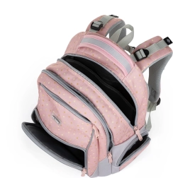 Két belső rekesz, számos kisebb zseb és két oldalzseb (cipzáras és nyitott) gondoskodik róla, hogy a tankönyvek, füzetek és a kulacs mindig áttekinthetően a helyükön legyenek.