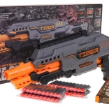 A csomagban 40 hablövedék található – 20 gumicsúccsal és 20 tapadókoronggal még több játékszcenárióhoz. A praktikus csúsztatható kidobóablak az esetleges elakadások azonnali megoldását teszi lehetővé. A tápellátást 6× AA 1,5 V elem biztosítja (nem része a csomagnak).