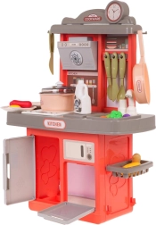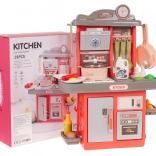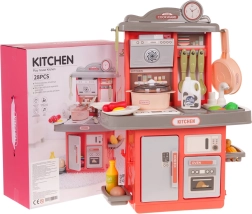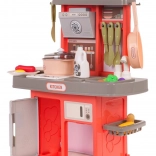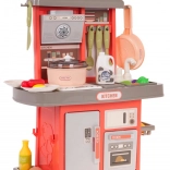 A vízkeringetéses (pumpás) csap hitelesebbé teszi a játékot, míg a gazdag tartozékkészlet – edények, eszközök és élelmiszer-utánzatok – lehetővé teszi, hogy a gyerekek saját „menüt” állítsanak össze. A konyha 3× AA 1,5 V elemmel működik (nem tartozék).