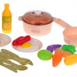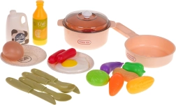 A 28 darabos készlet tartalmaz fedeles lábast, serpenyőt, tányérokat, evőeszközöket és széles választékú élelmiszer-utánzatokat. A gyerekek fantáziájuk szerint készíthetnek reggelit, ebédet és vacsorát.