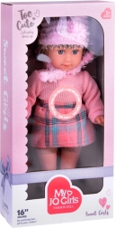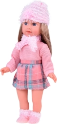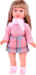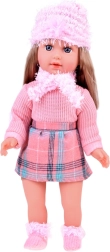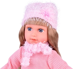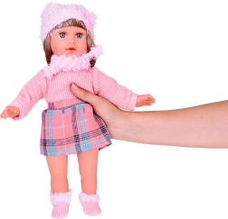 Bemutatjuk a gyönyörű Kate babát, aki angolul tanítja a gyerekeket. Ez a stílusos baba rózsaszín pulóvert, kockás szoknyát, zoknit, sálat és díszített sapkát visel. A baba magassága körülbelül 42 cm.