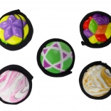 A színes labda gumiszalaggal ideális önálló vagy csoportos játékhoz. A gyerekek megtanulják a gyors reakciót és a mozgások koordinációját a labda elkapása közben. A játékszer praktikus tépőzáras szalaggal rendelkezik, amely kényelmesen rögzíthető a csuklóra, növelve ezzel a játék kényelmét.